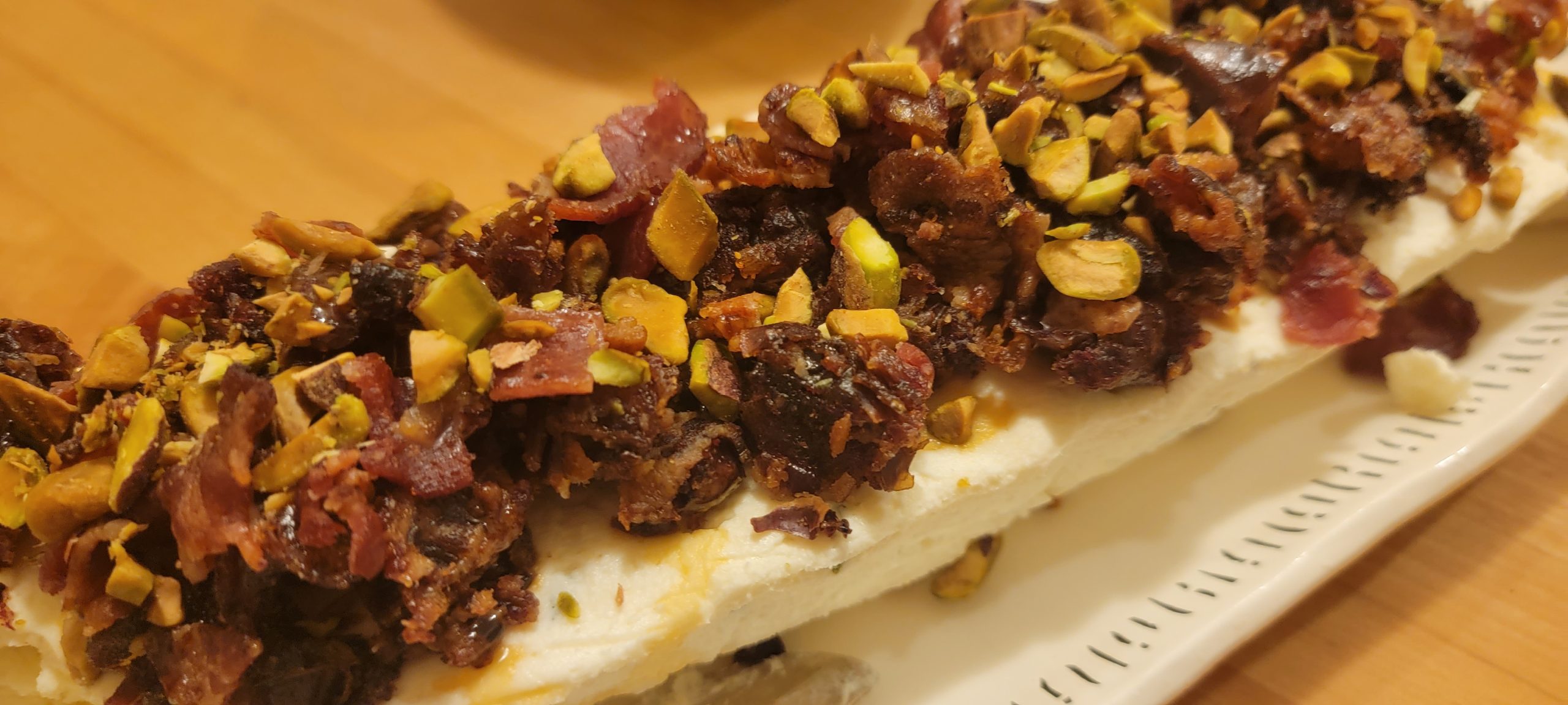 Note: I put my cheese mixture in plastic wrap and formed a log for the dish pictured and sprinkled with chopped pistachios and a little extra evoo drizzle on top.